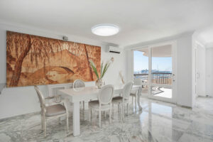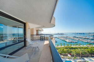 Este amplio apartamento cuenta con una superficie habitable de 241 m2 + 40 m2 de terraza cubierta / Porche ademas de un balcon de 3,5 m2 en la habitacion principal. Este apartamento tiene la gran ventaja de que su zona social y terraza poseen orientacion sur para disfrutar de muchos dias de sol al año ademas de que tienen vistas panoramicas al mar y la el puerto deportivo de palma, sin embargo el resto de su area habitable esta ubicada hacia la parte posterior del paseo maritimo, es decir orientacion Oeste, de esa forma hay mas tranquilidad de la actividad social, gastronimica y cultural del paseo maritimo y ofrece tambien proteccion y sombra en los calurosos dias de verano.Desde el salón principal de aproximadamente 100 m2 con chimenea y la gran terraza solárium se tiene una vista única al mar y al puerto deportivo. Espacios amplios y luminosas con pisos de mármol, con vistas al mar completan el ambiente noble y reflejan la elegancia a esta propiedad.