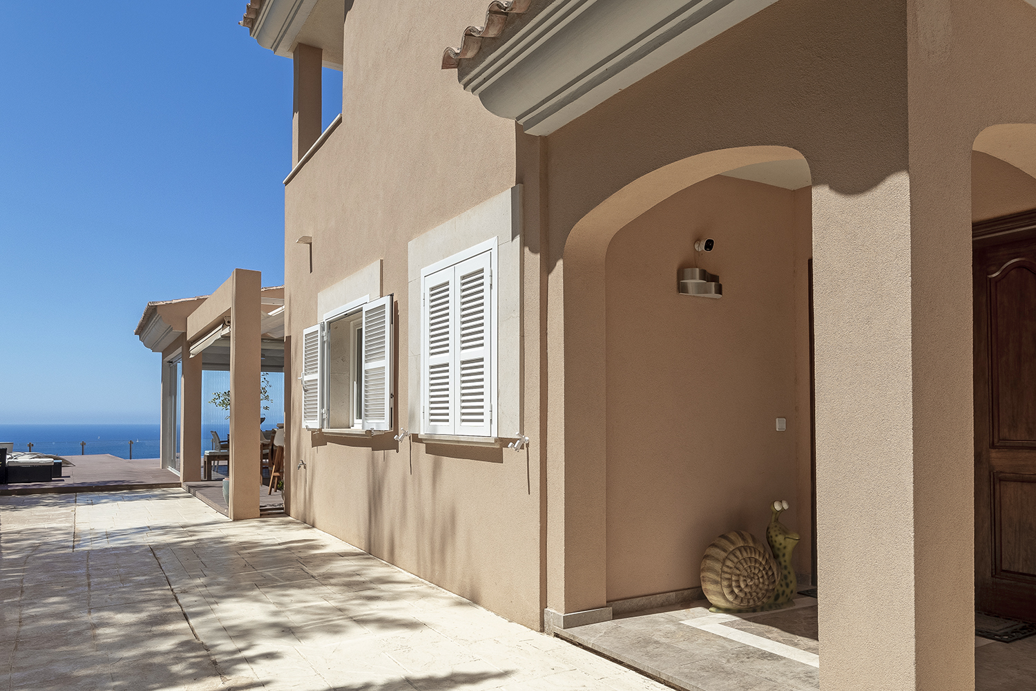 La propiedad esta distribuida en 4 plantas. La planta baja incluye una amplia zona de entrada, una habitación de invitados, un baño bien iluminado, una cocina totalmente equipada, que tiene un cuarto de coladuria independiente. Una gran caracteristica de este nivel es que el salón/comedor posee acceso directo a la terraza de invierno acristalada con paneles que se pueden abrir y cerrar lo que permite ser flexible en el uso de esta terraza en distintas epocas del año, esta terraza se comunica directamente con la zona exterior con su gran terraza y la piscina "infinity" de agua salada y hidromasaje de aproximadamente 32 m2, hay una ducha exterior y zona de barbacoa. Desde este nivel se accede atraves de una escalera al sotano que es el parqueadero subterráneo con capacidad de hasta 3 vehiculos. (2 autos y una motocicleta)En la primera planta hay tres dormitorios dobles con armarios empotrados y dos baños, uno de estos baños se encuentra en el corredor para ser compartido por dos habitaciones, tambien uno de estos dos dormitorios tiene un balcon con hermosas vistas al mar. El dormitorio principal tiene vistas al mar, vestidor y baño en suite equipado con bañera de hidromasaje.